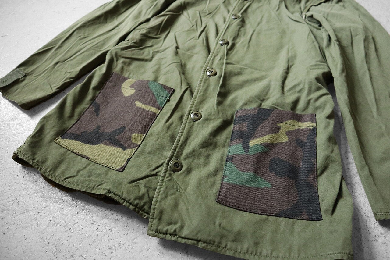 Dual bottom pockets are made from deadstock vintage US hunting and military camo from the 60‘s-90‘s. Top collar adorned with HGPress box logo fold over label. Additional hemming, sewing and buttons added by Emma Joyce