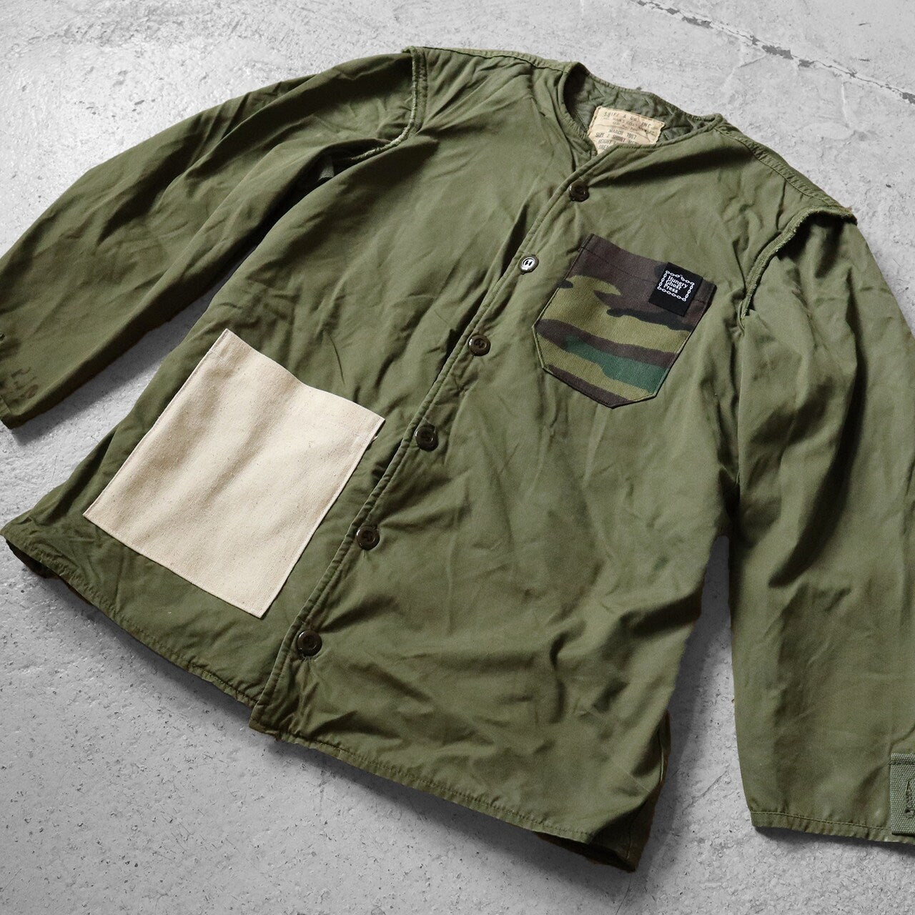 Bottom right pocket made from deadstock vintage raw natural canvas fabric from the 60‘s and top left chest pocket made from deadstock vintage US hunting and military camo from the 60‘s-90‘s with fold over HGPress box logo label.