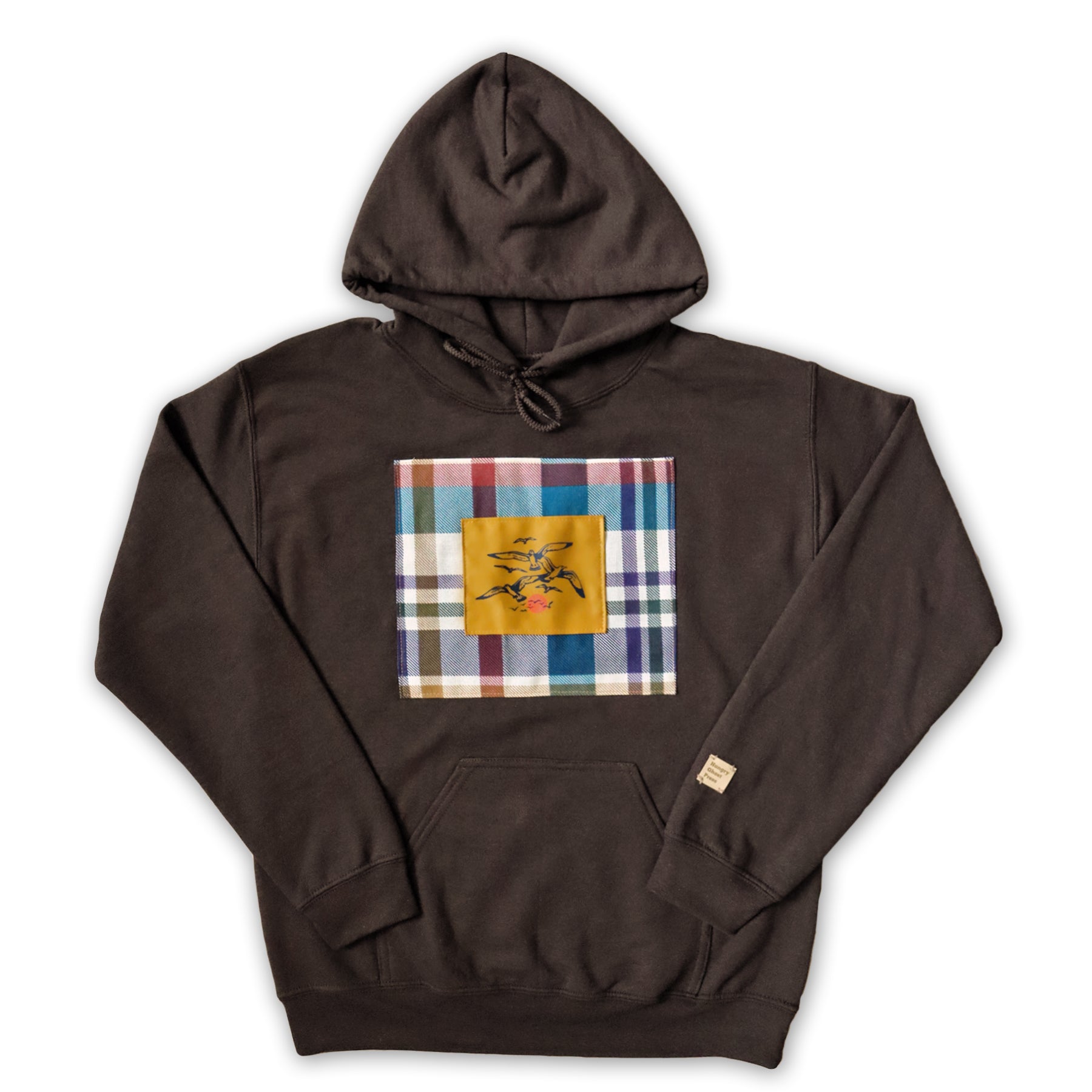 · Found plaid fabric sewn on center chest with 1970‘s silkscreen transfer print on vintage fabric· 8 oz mid weight hoodie· 50/50 Cotton-Poly blend· Unisex fit· Canvas center patch and kangaroo pocked stitched on in PVD