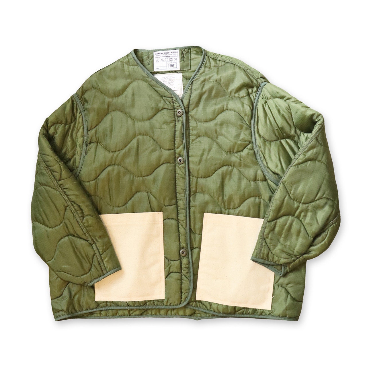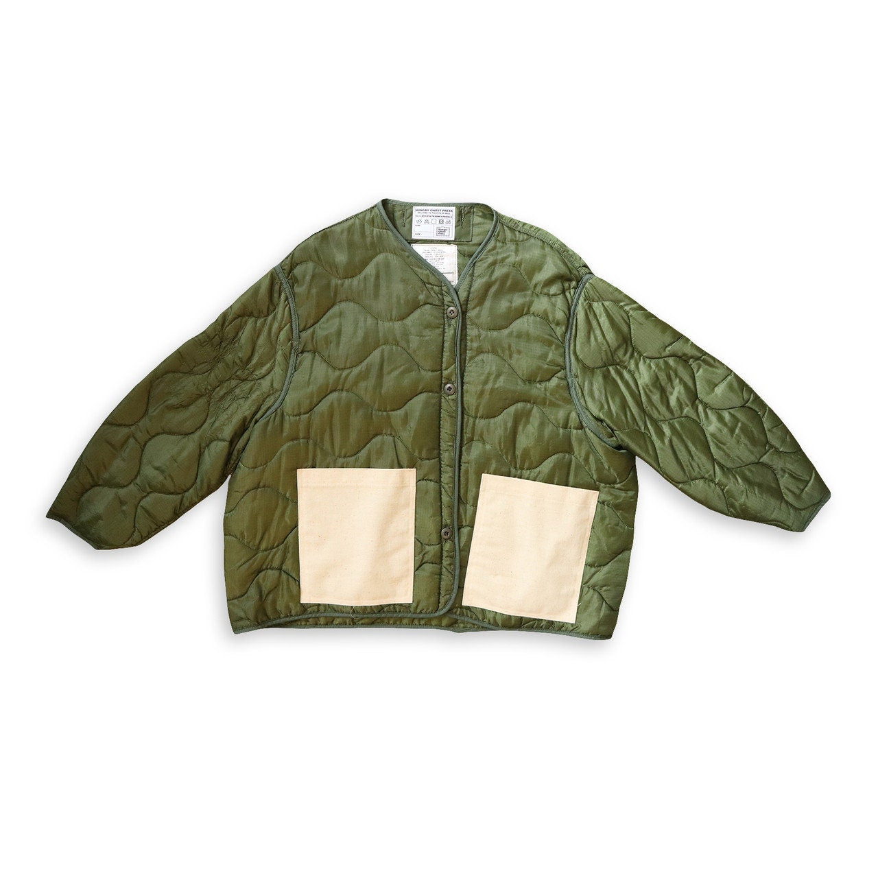 Vintage cold weather M65 coat liner reworked and upcycled to the perfect lightweight jacket. Quilted liner exterior: 100% nylon
