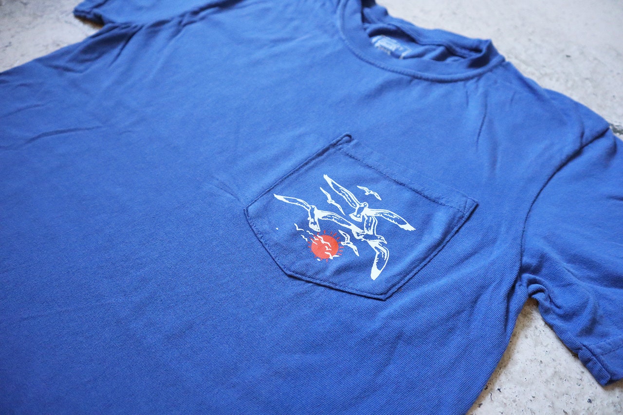 Care for instructions for shirts with vintage prints. New stock comfort color pocket tee with dead stock silkscreen transfer are considered moderately delicate items and should be treated as such. Do not iron on front or back of vintage prints unless using a proper heat protection sheet. We recommend turning item inside out and gently washing by machine or hand using cold water, then hang to dry. If hanging is not an option delicate, tumble or low heat is suggested on dryers.