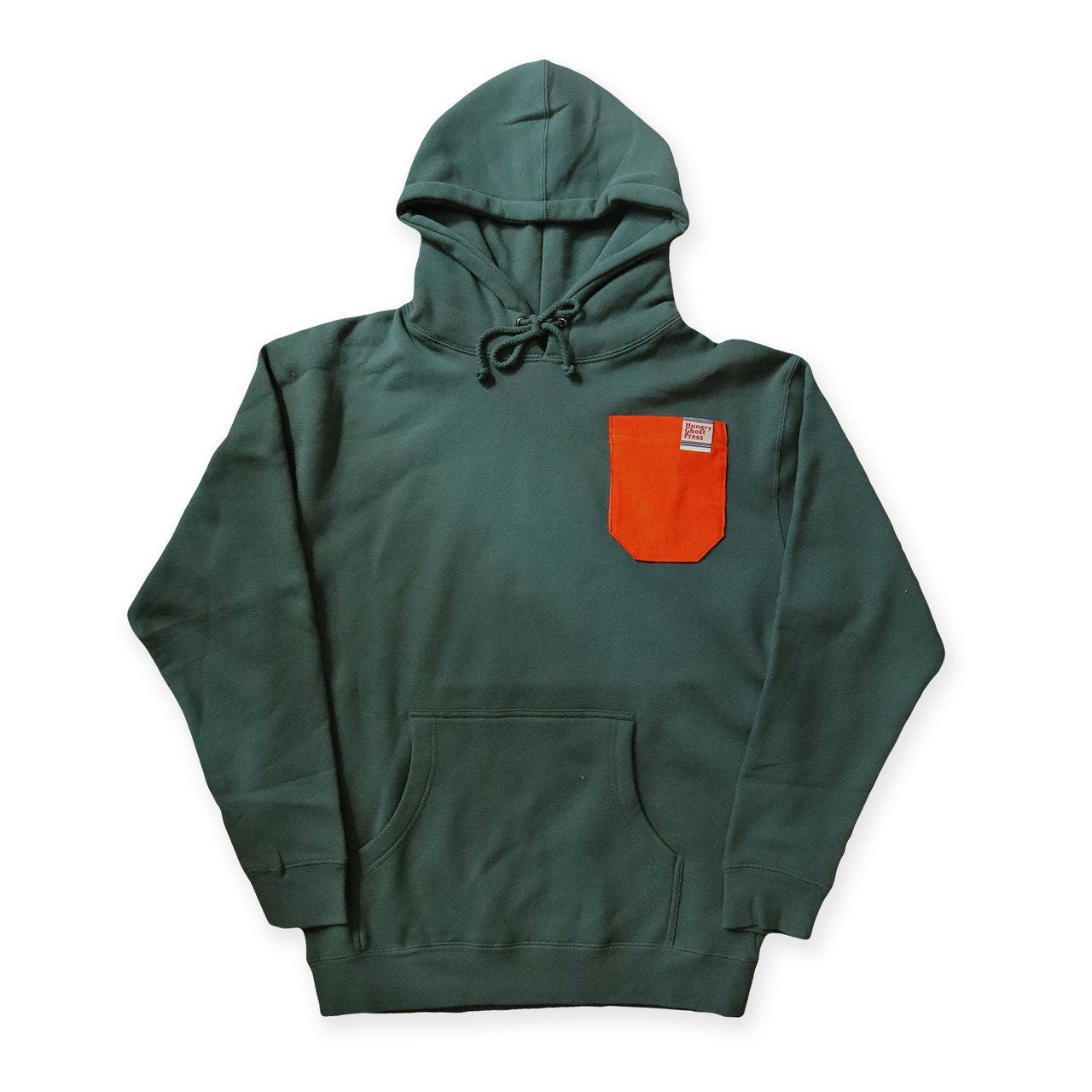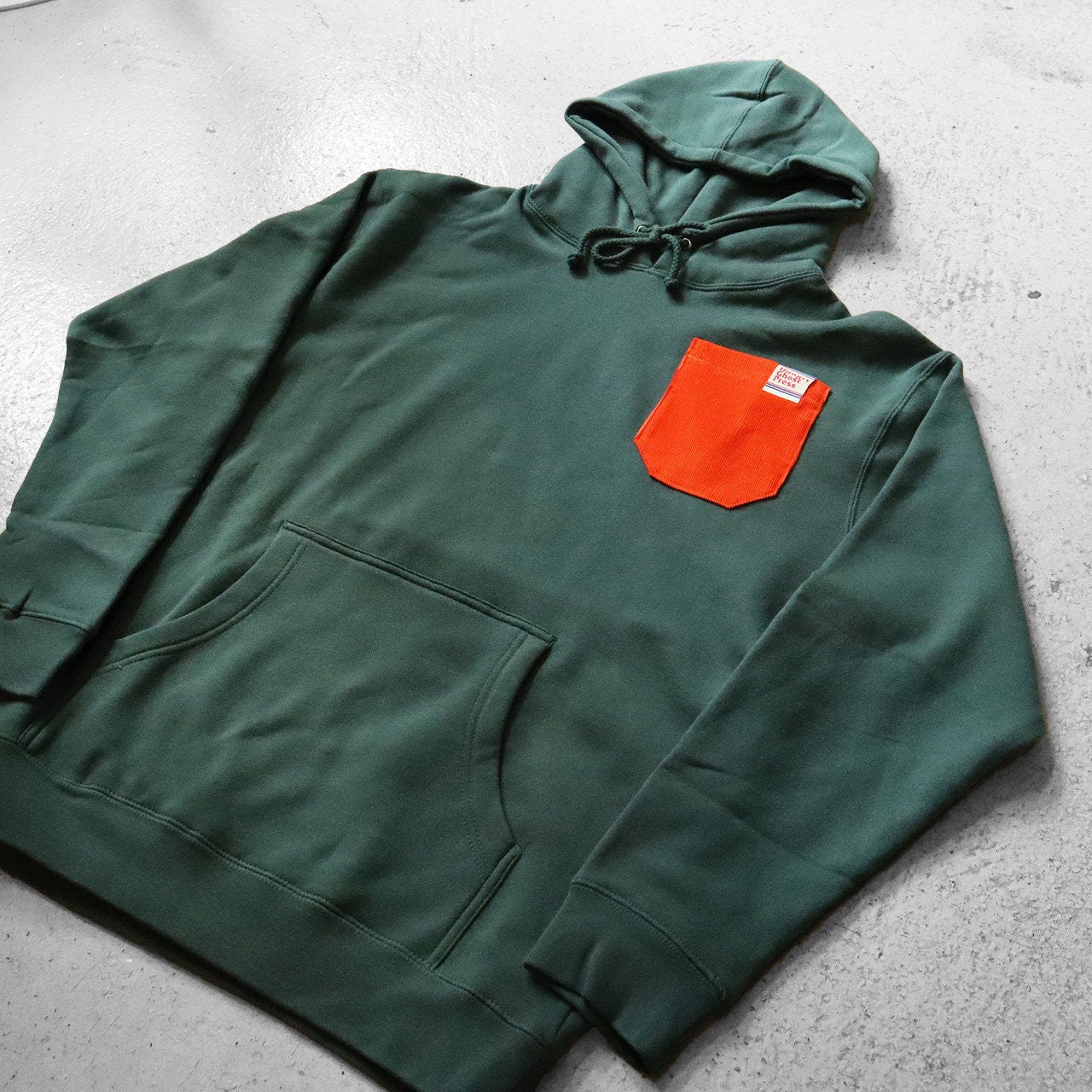 Heavyweight hooded sweatshirt with a vintage deadstock orange high-vis corduroy hunting pocket.