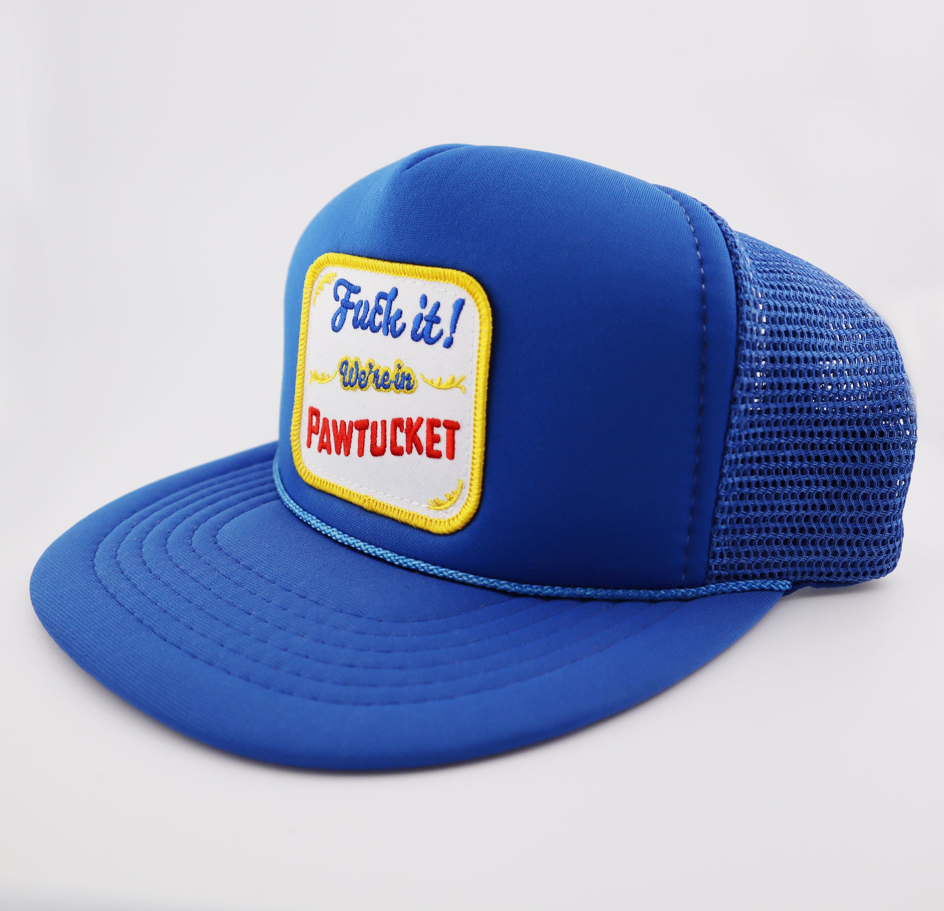 Our Pawtucket Patch sewn onto a vintage trucker hat.
