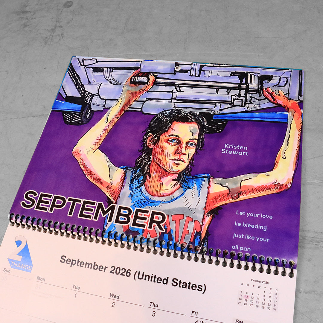 Each month showcases a brand-new painting created by Two Thangs, printed in full color on heavy satin cardstock. Hang it in your garage, your office, your workshop, or anywhere that needs more bad decisions with great aesthetics.