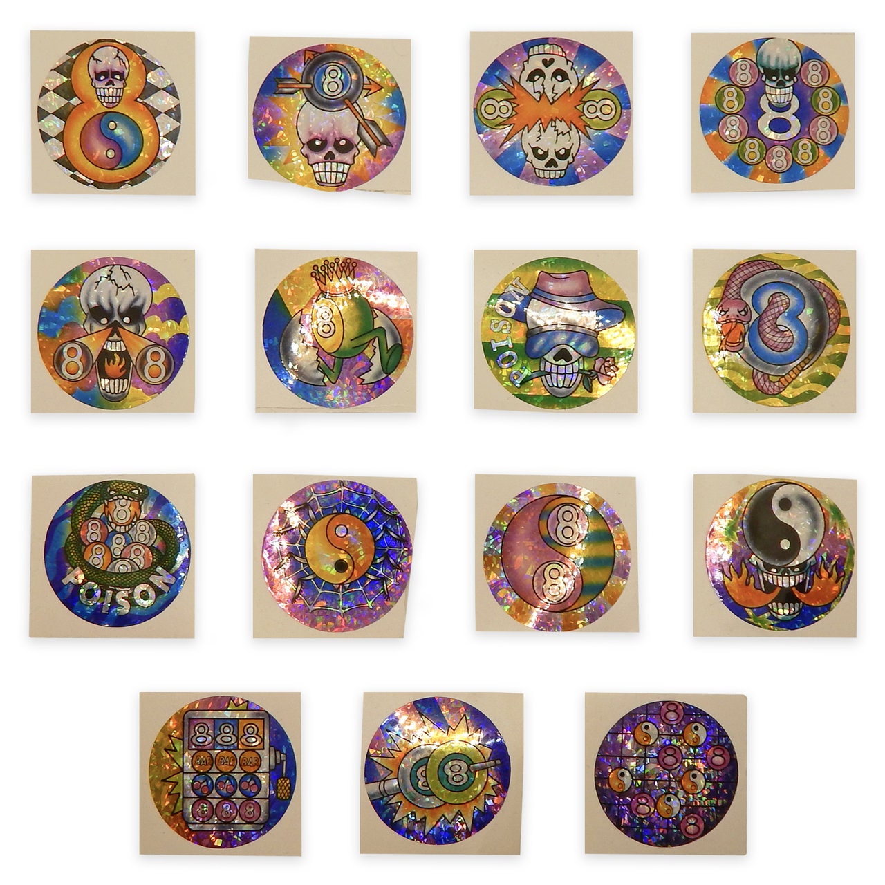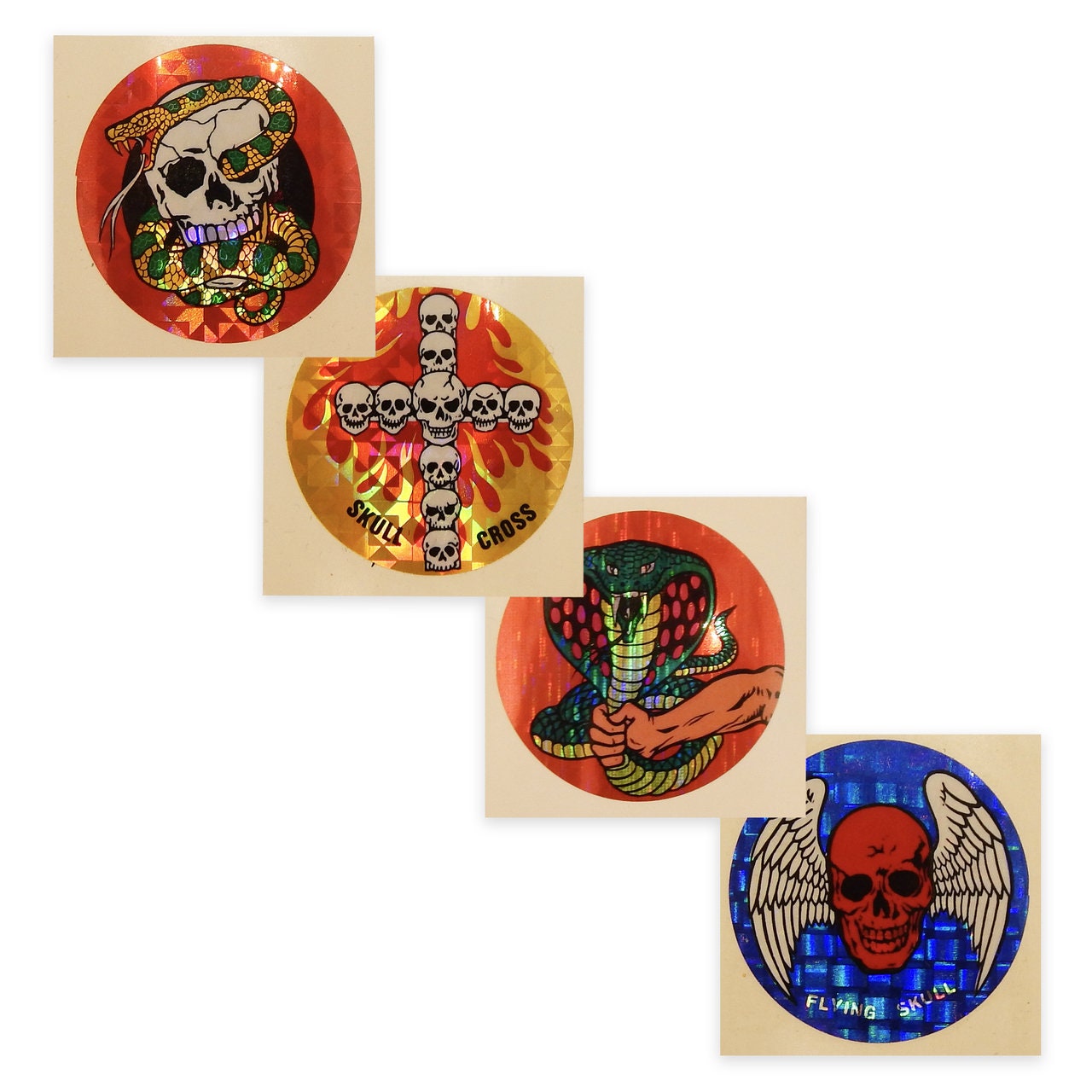 Random Stickers may have skulls, birds, spiders, yin yangs, etc but all are holographic.